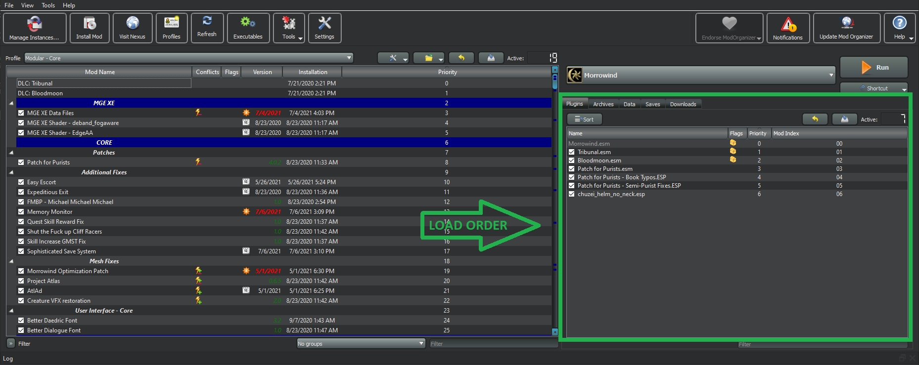 DLC: BloodmoonOn the right pane, you can see all the plugins listed in the order that Morrowind will load them, with plugins at the bottom overwriting those at the top in case of conflicting records. While MO2 allows you to reorder plugins, it can be slow, especially with a large number of mods. To automatically sort your plugins, you can use Mlox or manually sort them using Wrye Mash.